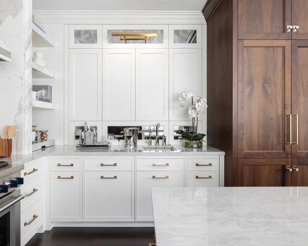 When their residence needed updating, these empty-nesters decided it was time to plan for aging in place. The project included the primary bath, lower-level family room, kitchenette, wine cellar, upstairs en suites, and main floor areas. In the narrow kitchen, two stools were added to the island, and a built-in banquette and breakfast table by the window provide a cozy sitting and dining area.