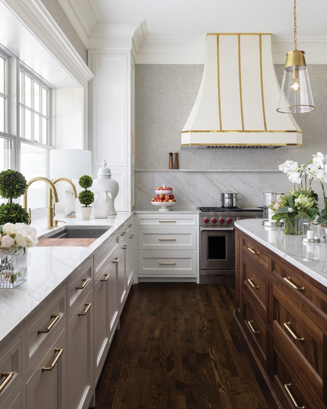 “The scale of this customized metal hood really fits the room — especially the 12-foot ceilings — beautifully, as it pulls your eye upward to the beautiful, stacked crown molding. The soft white and brass tones pull on warm, traditional materials found in English Revival homes from this time period. Underneath the customized hood, you’ll find a stainless steel Wolf hood insert.