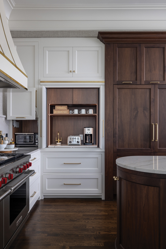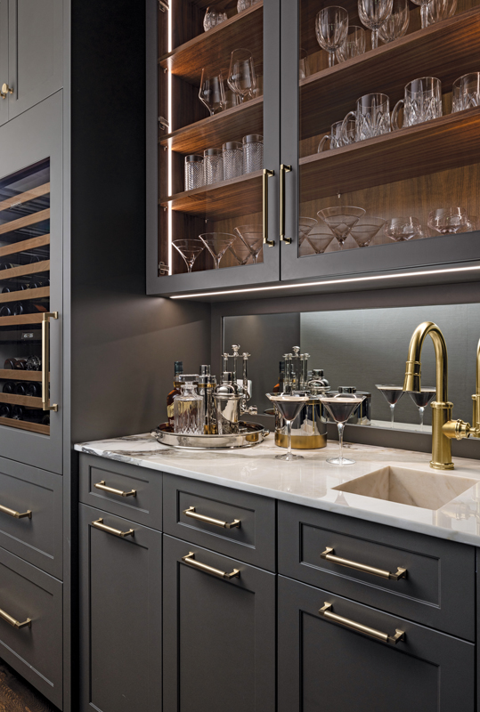 Another challenge was designing to the nearly 12-foot ceilings. “At that height, we didn’t want the cabinetry to go all the way to the ceiling and create narrow, vertical spaces, or even just be unreachable,” Tolles says. “By integrating a tall, stacked crown molding and introducing alcoves whenever possible, we were able to keep the cabinetry to a manageable height that draws the eye up, but without creating vertigo.”