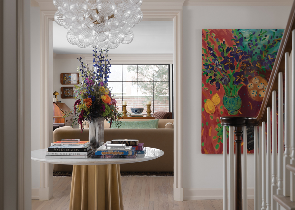 Loperfido was up to the task and says she enjoyed “shopping their home” when the project began. She started by adding a large table and dramatic chandelier to the front hall, and moving a large piece of art made by one of Lisa’s friends from a back hallway to a new location near the stairs. “I told Lisa (it needed) to be front and center,” the designer explains, noting that the piece echoes the palette in the nearby living room and ties the two spaces together. She also moved a large rug that was in the cocktail lounge into the living room, where it provided the jumping-off point for the whole room’s color palette. Vintage trays, once hidden in a cupboard, are now used as art on a living room wall.