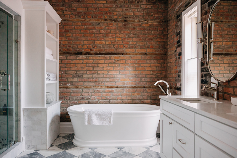 That same exposed brick is abundant in the primary bathroom, where neutral colors allow it to take center stage. Working within the existing footprint, the team elevated the room with a custom vanity (replacing a small table) and a half wall that separates it from the toilet. Shelves that match the vanity were placed beside the soaking tub, and small ledges in the shower stand in for a full bench to keep it feeling larger.