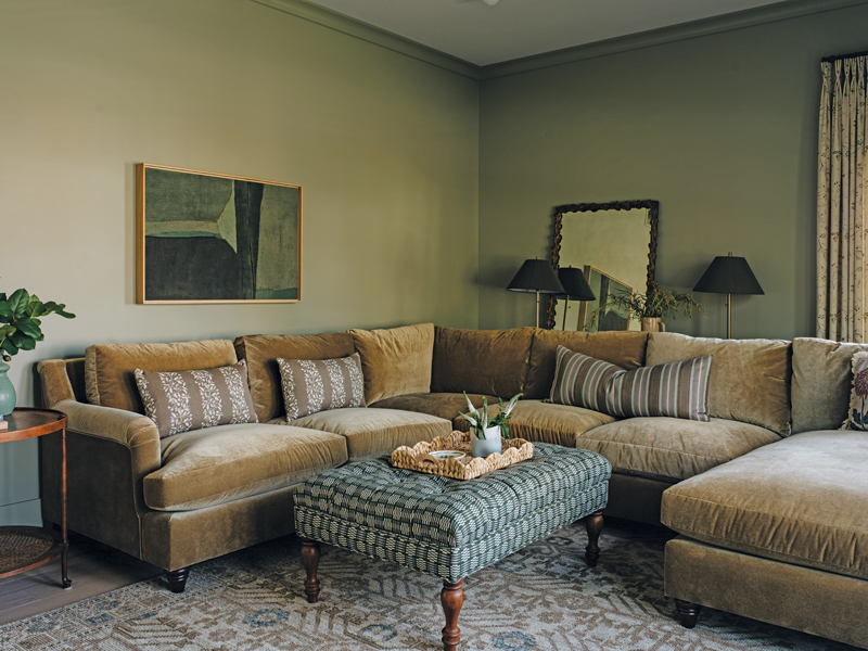 Guests can see the new Foliage wallpaper in Ventura’s recently updated playroom, which now serves as a hangout spot/game room for the boys. Their “cozy room,” as the family calls it, features custom drapery in the new Thicket fabric, fabricated by Slipcovey in Royal Oak. In the dining room, Verte stands out in a custom linen Roman shade.